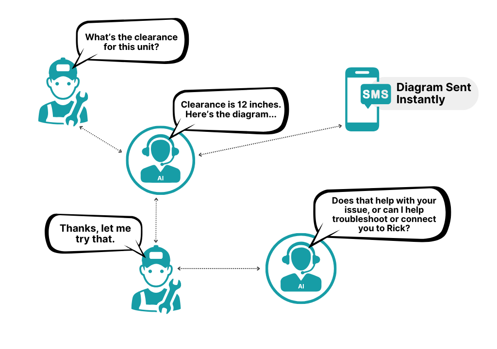 The AI replies instantly with the answer and diagram—no calls, no delays, no interruptions.