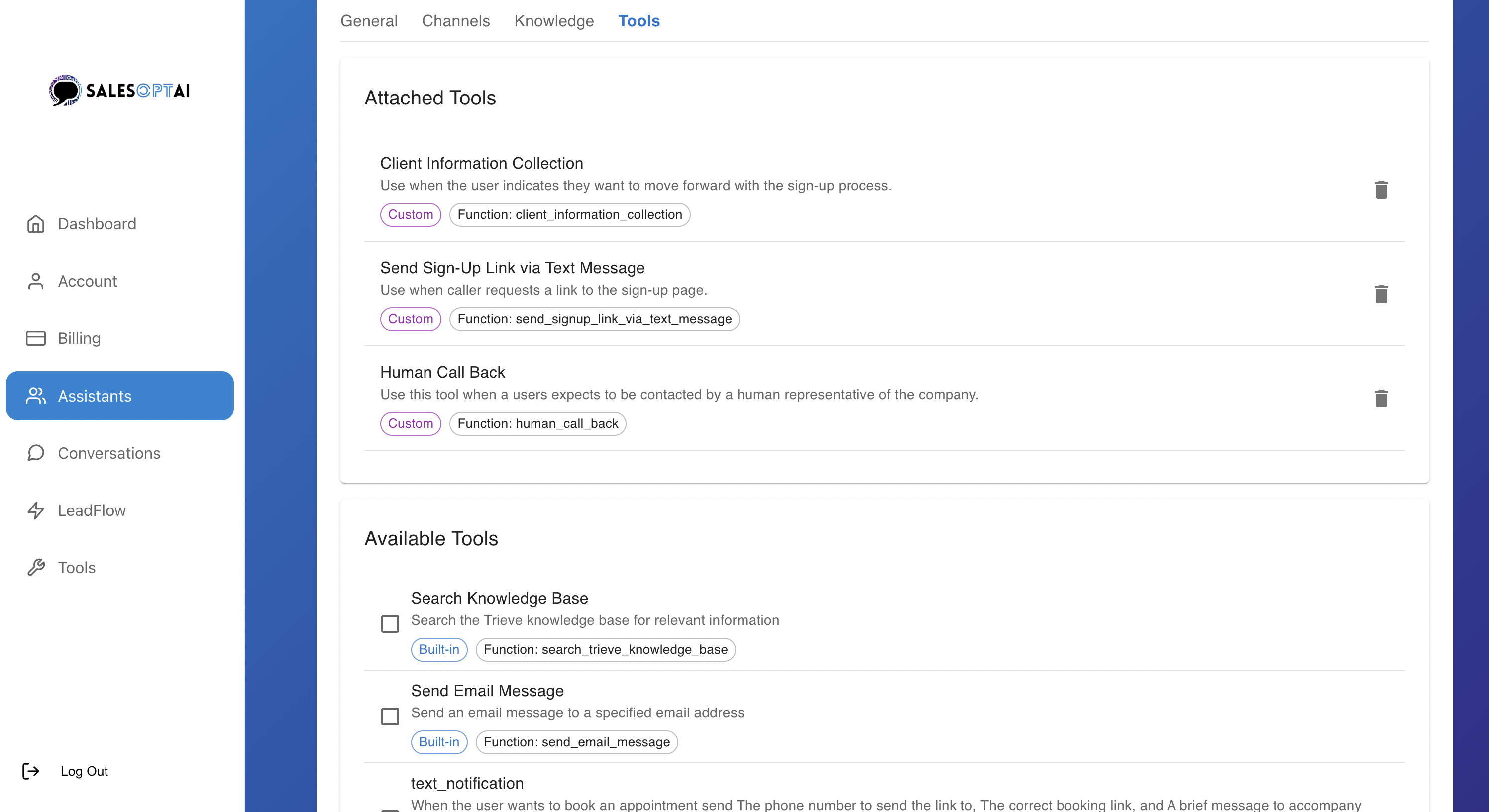 Tools allow your Assistant to take action and complete real business tasks. While your knowledge base holds static information, tools let your Assistant pull in live data or perform tasks—like checking the weather, sending a text message, or interacting with your CRM.